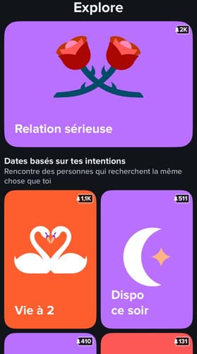L’onglet Explore a, depuis quelques mois maintenant, changé d’apparence. Au lieu de centre « d’accueil » avec les news Tinder, des événements et autres rencontres possibles, l’onglet Explore met maintenant l’accent sur les différents types de rencontres qu’il est possible de faire.